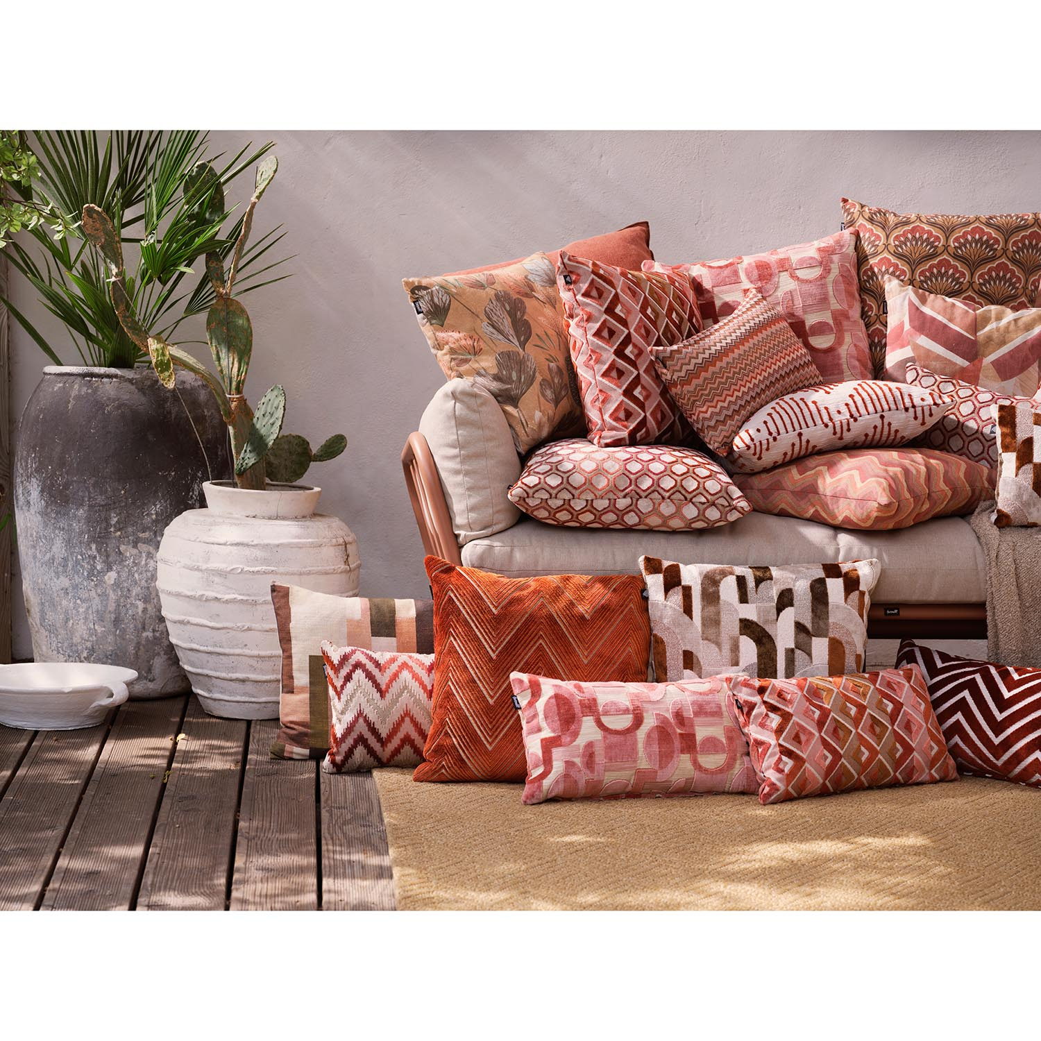 Bonita Pink is een luxe, retro-geïnspireerd dessin met cirkels, halve cirkels en blokvormen in warme roze- en zalmtinten op een elegante beige basiskleur. De 100% viscose stof voelt zijdezacht aan en geeft het kussen een rijke, glanzende uitstraling. De afritsbare hoes en stijlvolle structuur zorgen voor een verfijnd, warm en chic accent in elk interieur.